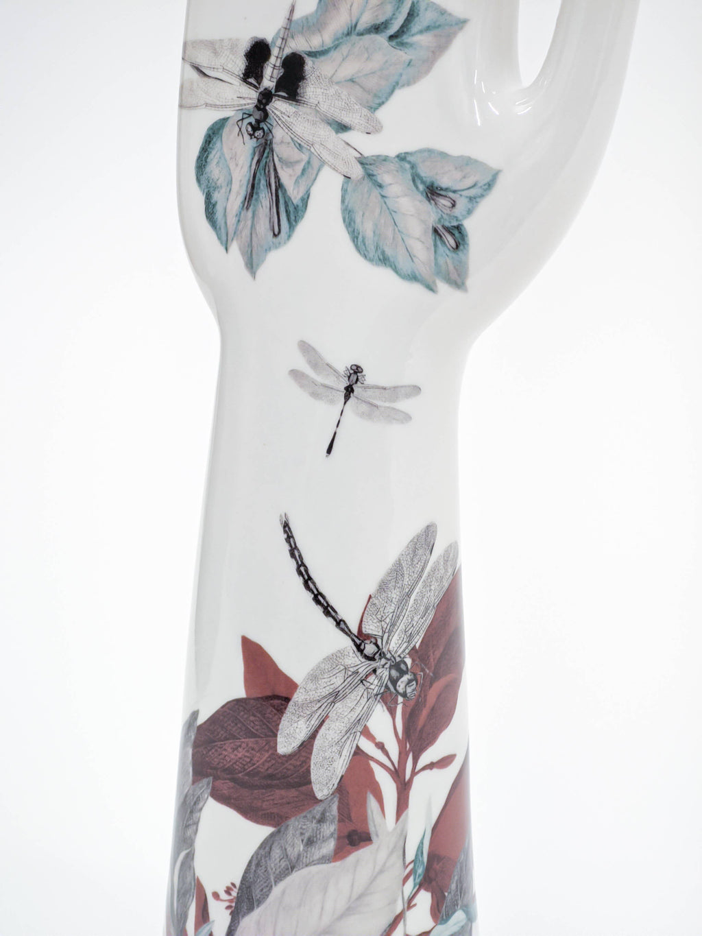 The porcelain hand from the Anatomica collection is a timeless design object. The production of these porcelain is entrusted to Fratelli Majello, who have been masters of the Capodimonte workmanship since 1867. Each hand is decorated with flair and imagination, having the possibility of integrating perfectly into any environment, whether it is a bedroom, the living area, or as a jewellery holder. This hand is decorated with black and white, red, turquoise leaves and several dragonflies hover on them.
