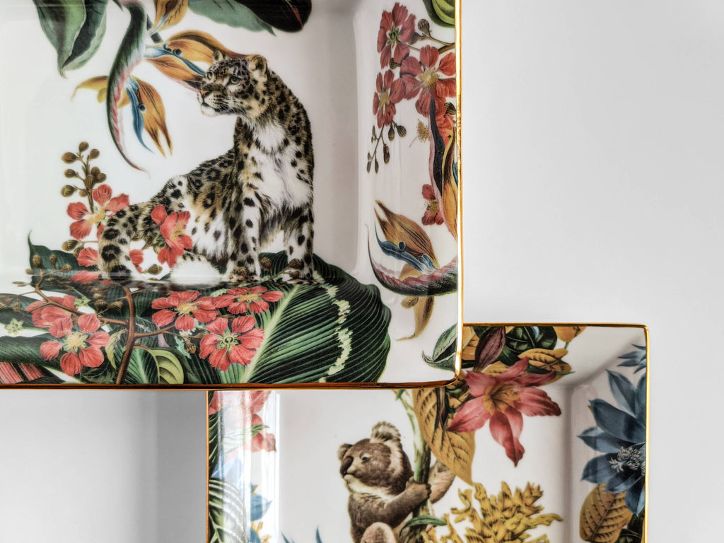Stylish and decorative, this porcelain set is made up from a valet and ashtray. Excellent in the entrance, on a coffee table in the living room, a shelf or even hanging on the wall like two small decorative windows. This set is part of the Animalia collection, characterized by colourful tropical flowers that guard two animals from the world's forests.