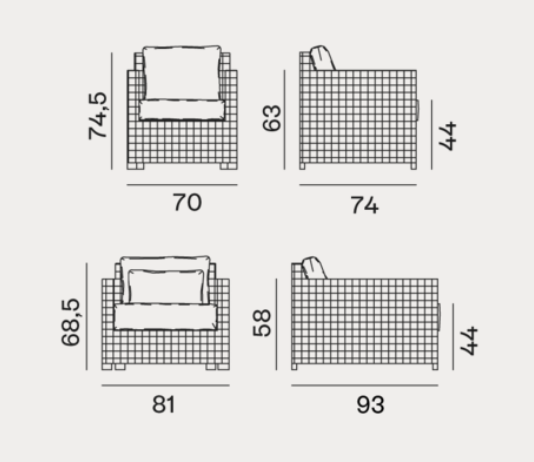 A structure with squared lines but of great visual lightness characterises the family of WK armchairs, available in two different seat depths. A proposal with a charm that is both classic and exotic, with a beech structure covered with a texture made with interweaving of natural parchment, featuring soft loose seat and back cushions.