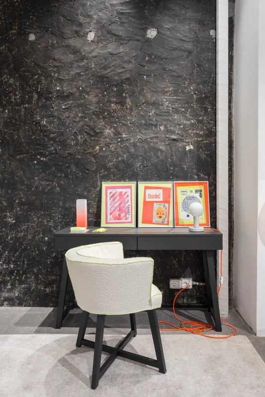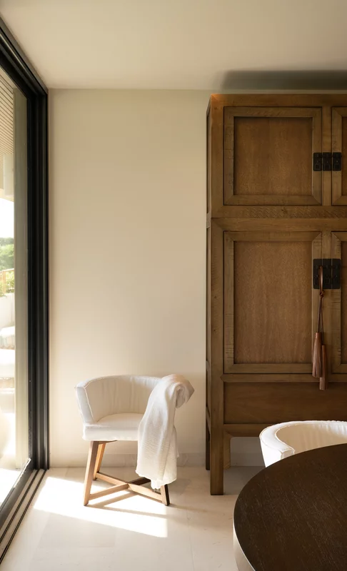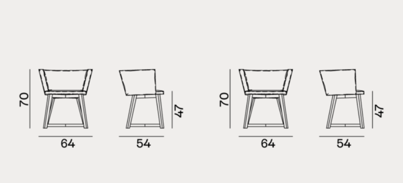 Gray 26/27 is a family of dining armchairs with an enveloping backrest in the shape of a semicircle, available with padded seat and back with removable cover and visible stitching. The solid wood legs intersect, forming a cross. The structure is made of natural painted Canaletto walnut, bleached oak or white, grey, black, ocean, dove-grey, blueberry, date, ginger lacquered oak.