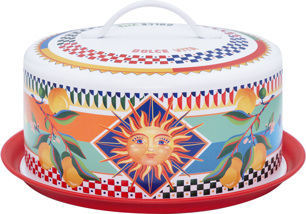 Cake plate with dome in stainless steel. Rubber ring on the plate to seal and secure the dome in place. Practical for cakes or any food outdoor and indoor.