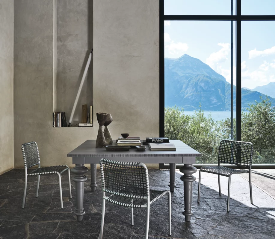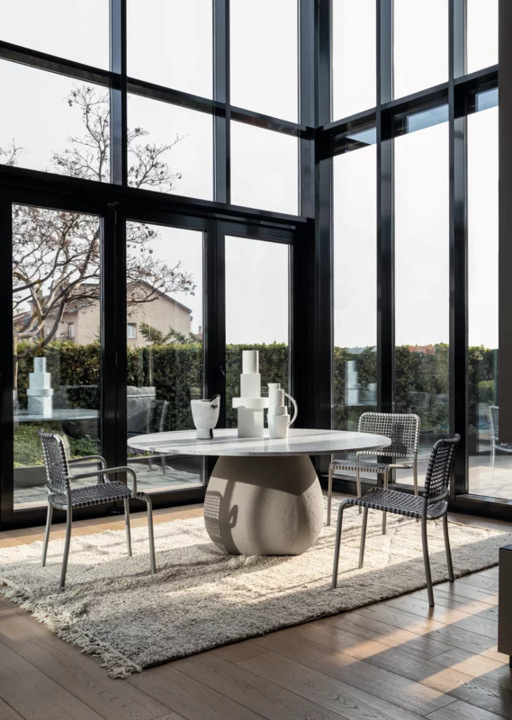 Versatile and comfortable, the Allu chair family combines the lightness and essentiality of the anodised aluminum tubular structure with a dynamic mix of textures, created by the weaving in natural or grey parchment. Able to fit into any environment, from domestic to contract, Allu is characterised by clean lines and geometric and essential shapes, and is available in two variants: chair and armchair with armrests, with the weaving either in grey or in natural colour .