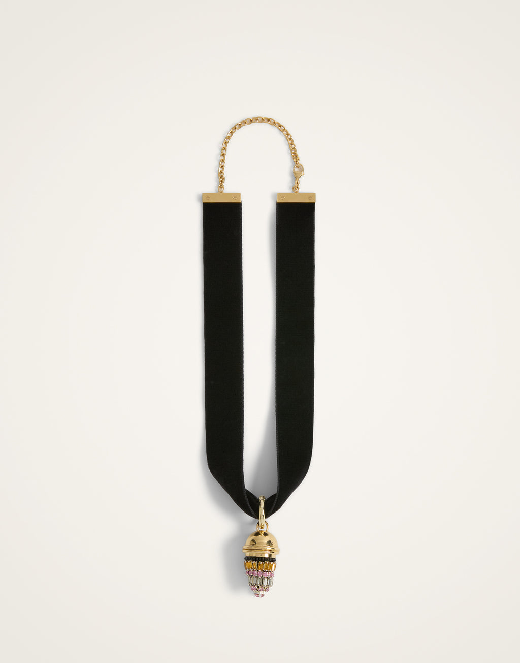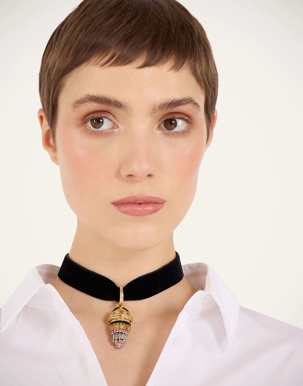 - Velvet Necklace with 24K Gold Plated Brass and Crystal Embroidery Pendant