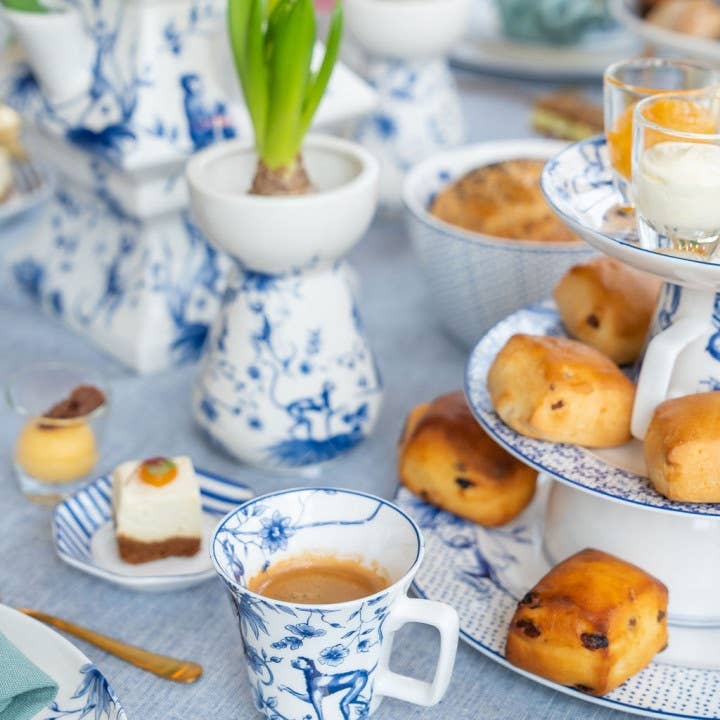 Richly decorated porcelain coffee cups with monkeys and traditional Delft blue details.