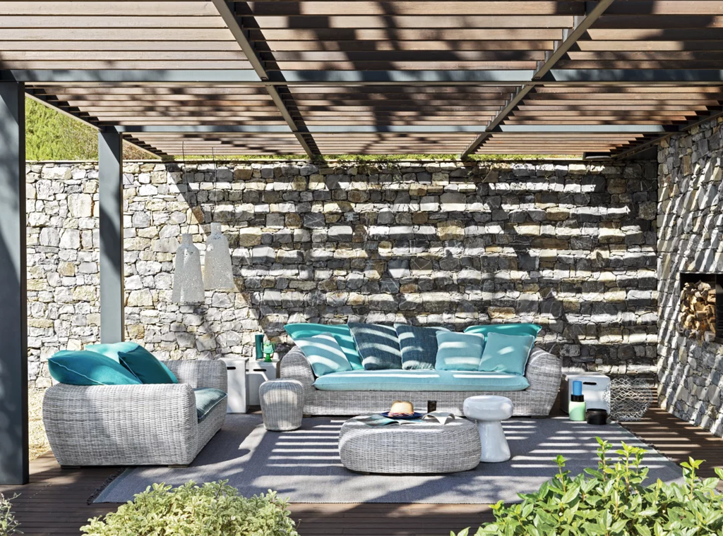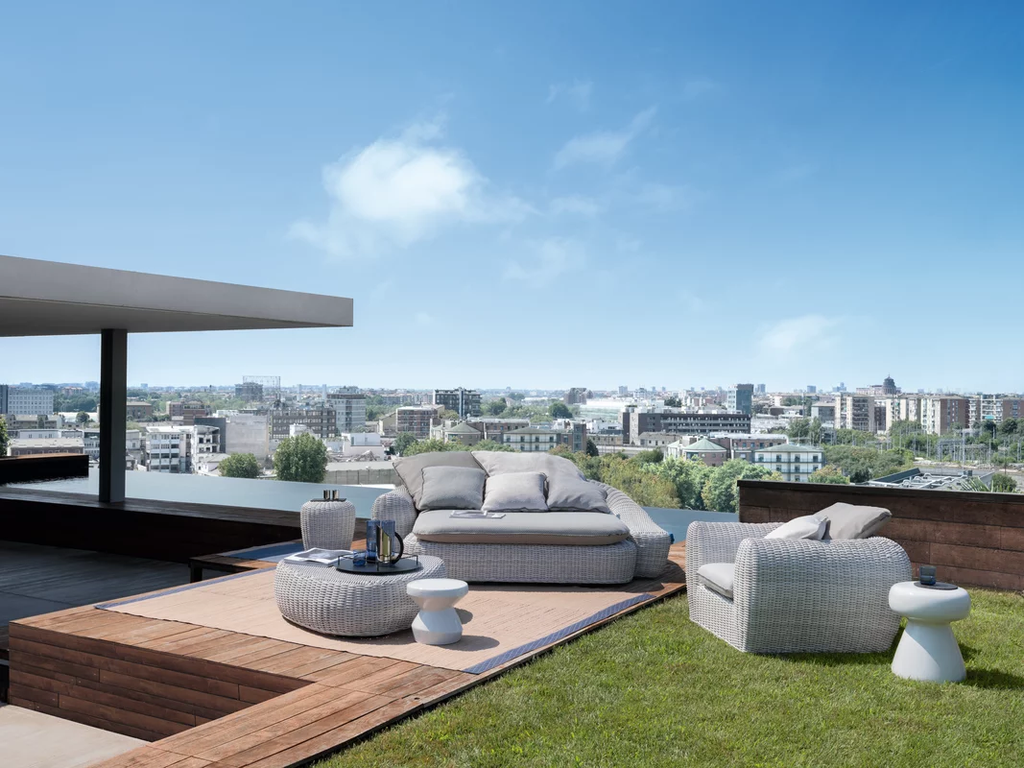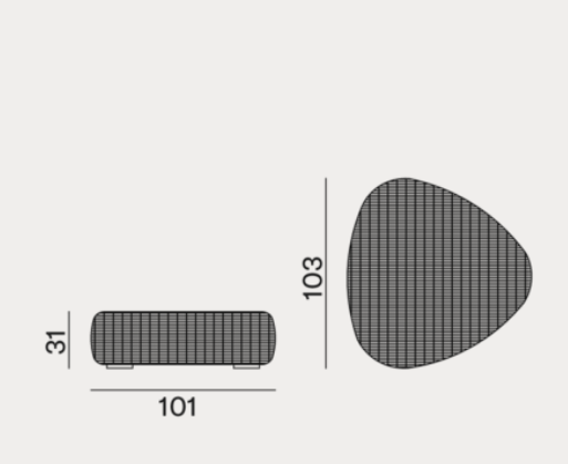 Triangular shape with rounded corners and full volumes characterise the Panda 11 coffee table, made of a structure and feet in aluminium and weave in white/grey Panda Resin synthetic polyethylene fibre. Synthetic fibres of the latest generation designed to resist water and light and to maintain over time the technical and chromatic qualities, maintain a very natural and durable appearance.