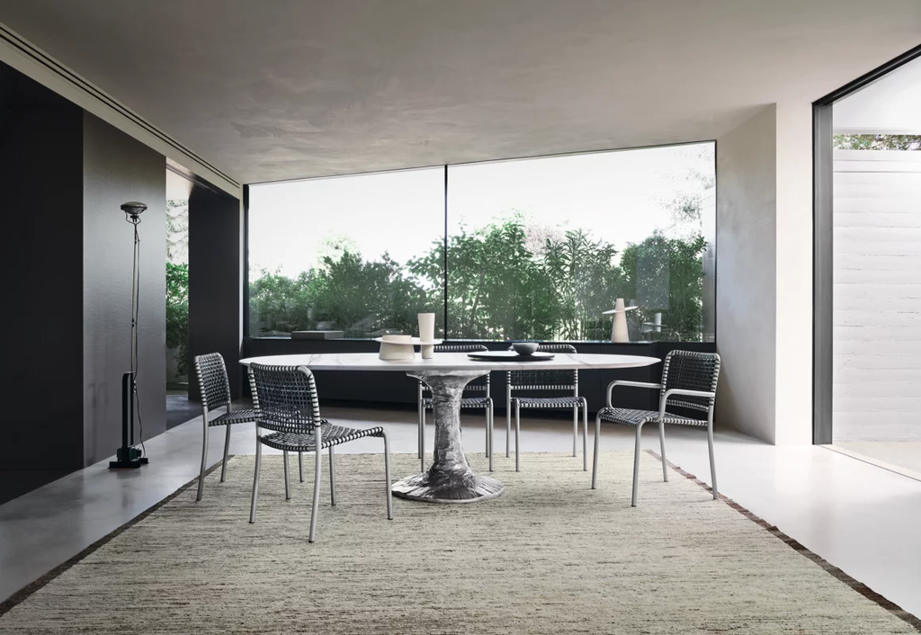 New combinations of materials characterise the Next 132/136/137/138 table family. Available with round or oval top in two sizes, they are characterised by a top available in white Carrara marble or natural painted Canaletto walnut or white, grey, black, ocean, dove-grey, date, blueberry and ginger lacquered American walnut. The base, on the other hand, is made from a single central leg made of polished cast aluminium: the light reflecting on the surface creates a visual effect that is different every time.