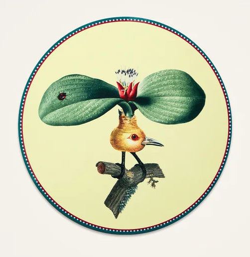 The best table settings start with a stellar foundation. These highly decorative Disk Placemats made from compressed, durable, natural materials make for a stunning statement on any table. Adorned with the adorable Leaf Flyer from our Fantastic Creatures Collection with surrealist artist, Beto Val, this placemat not only elevates your tablescape, but your energy also, a radiant reminder that one can still grow during shadow season.