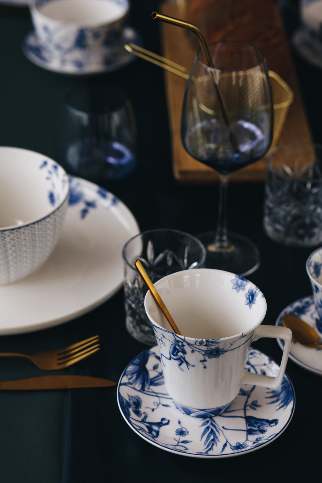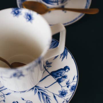 Richly decorated porcelain dessert plate with monkeys and traditional Delft blue details. Dishwasher, microwave and oven safe.