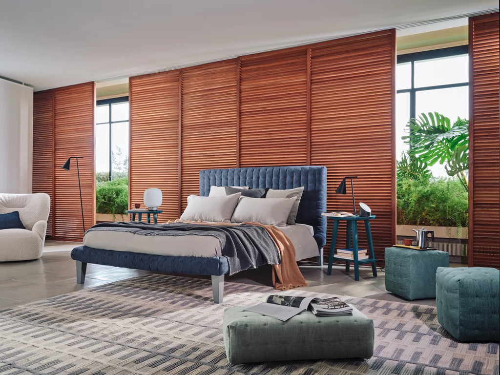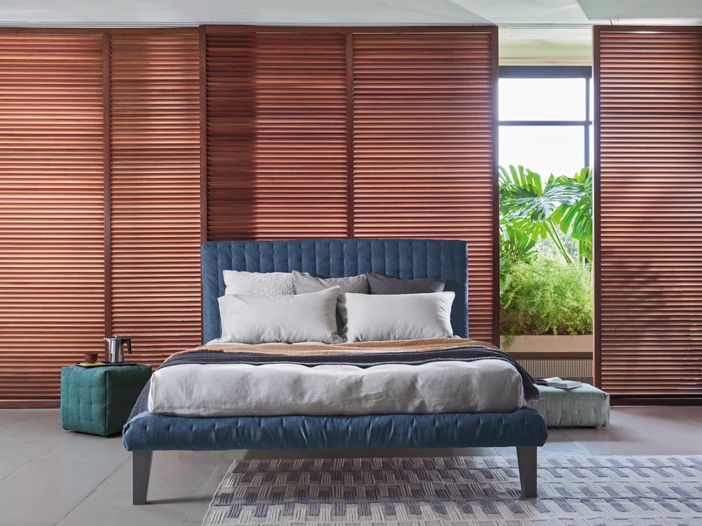 Upholstered ottoman with removable cover. Cover in quilted fabric with inner seam. Black lacquered solid wood feet. Available in two dimensions.