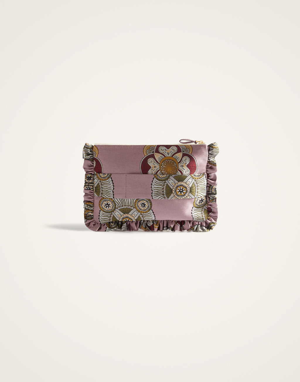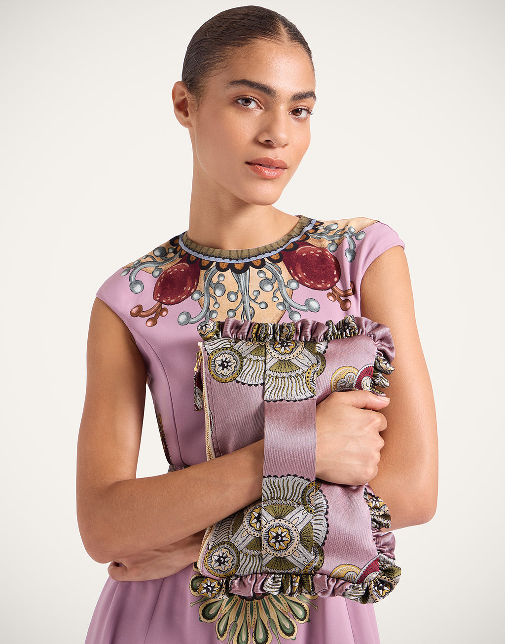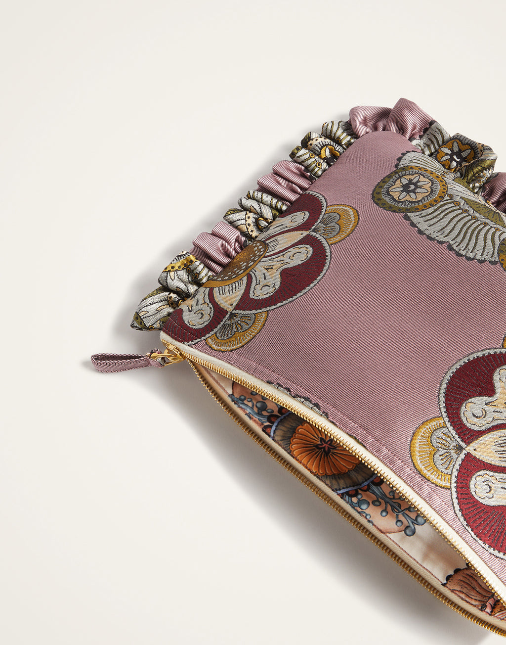 Our soft, zip pouch is a multi-use beauty that not only elevates the status of your dinner-to-dancing outfit, but will easily house a cell phone, mini tablet and cardholder. The side handle makes it super simple to carry around which gives you free hands to hold your Bellini at a cocktail party. Outrageously elegant in this Nucleus-print silk jacquard!