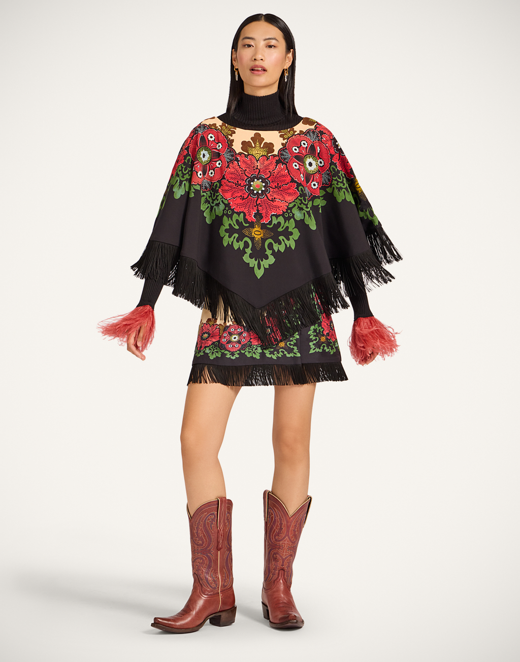 Delivered in this sleek Italian satin with a touch of stretch, the Mini Poncho arrives in our hand-placed prints with fringes all along the hem for extra flourish. An easy everyday outfit upgrader you can also lip it over a silk dress at a wedding when the sun goes down for extra wow.