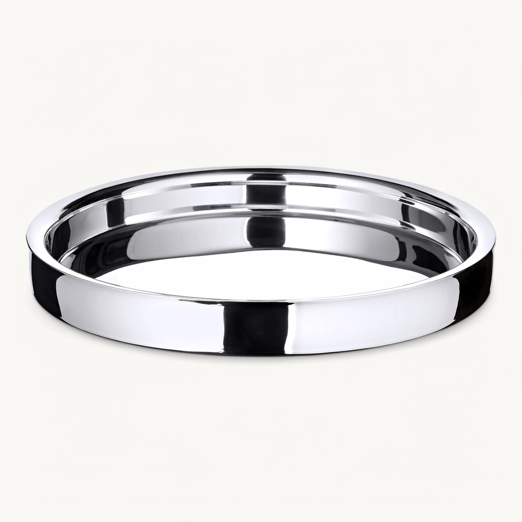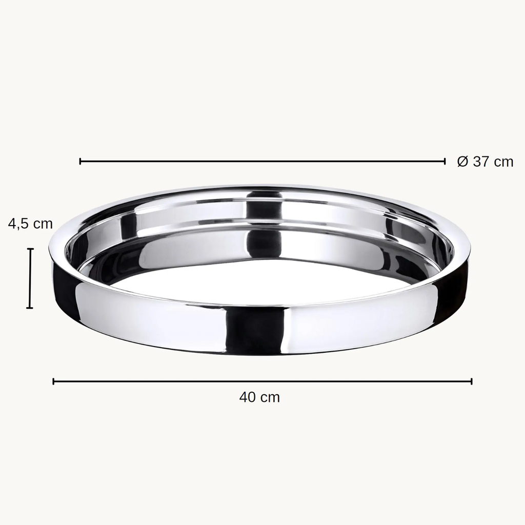 Round serving tray in mirror-polished stainless steel, minimal and contemporary