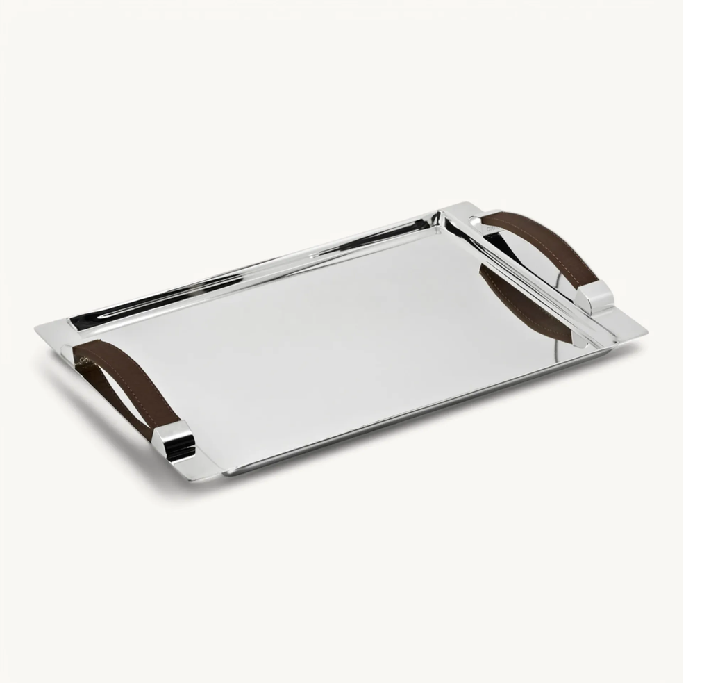 Rectangular serving tray in tarnish-resistant, silver-plated stainless steel with faux-leather handles