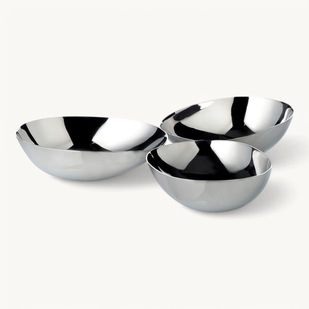 Triple snack bowl in high-gloss polished stainless steel, comtemporary and minimalist
