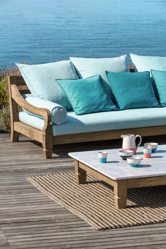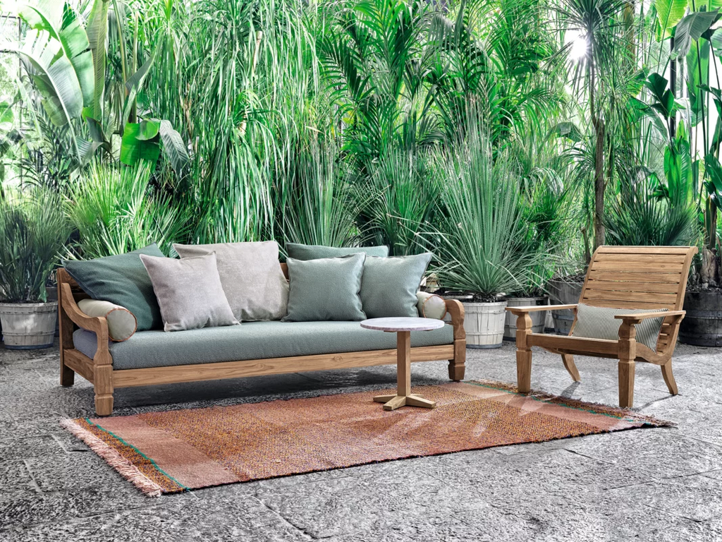 The Gervasoni Jeko Sofa, designed by Paola Navone, offers a blend of colonial-inspired elegance and eco-conscious craftsmanship. Its frame is constructed from ECOTeak, a material sourced from reclaimed teak beams and elements, meticulously repaired and polished to highlight the wood's natural grain. This sustainable approach not only preserves the environment but also imbues each piece with a unique character.