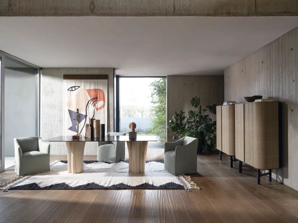 A strong and distinctive sign characterises the Brick 33/34/36/38 family of tables. Nordic references are evident in the base made of sections of natural debarked hornbeam trunk, which is in visual contrast to the thin waxed iron sheet top. Available in different sizes and with rectangular, square and round tops, the product combines natural materials with industrial touches.