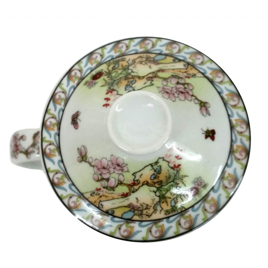 White porcelain mug with beautiful ladies and cranes in a palace garden scene. Includes porcelain strainer insert to catch your Chinese tea leaves and matching lid to keep your tea warm.